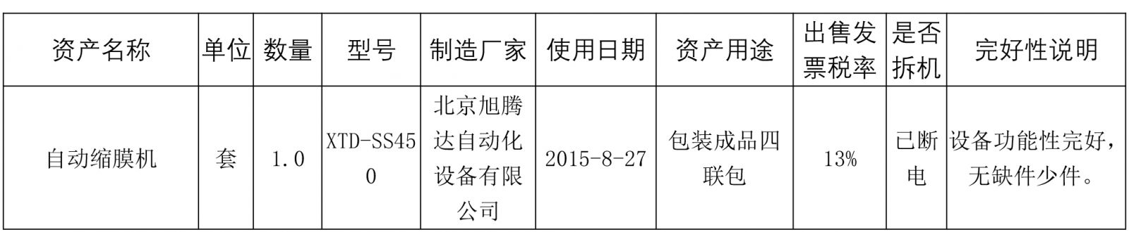 標的二:自動縮膜機設備一批(具體見附件),標的設有保留價,標的保證金為2萬元,起拍價5萬元(含稅,稅率見詳情表) ;